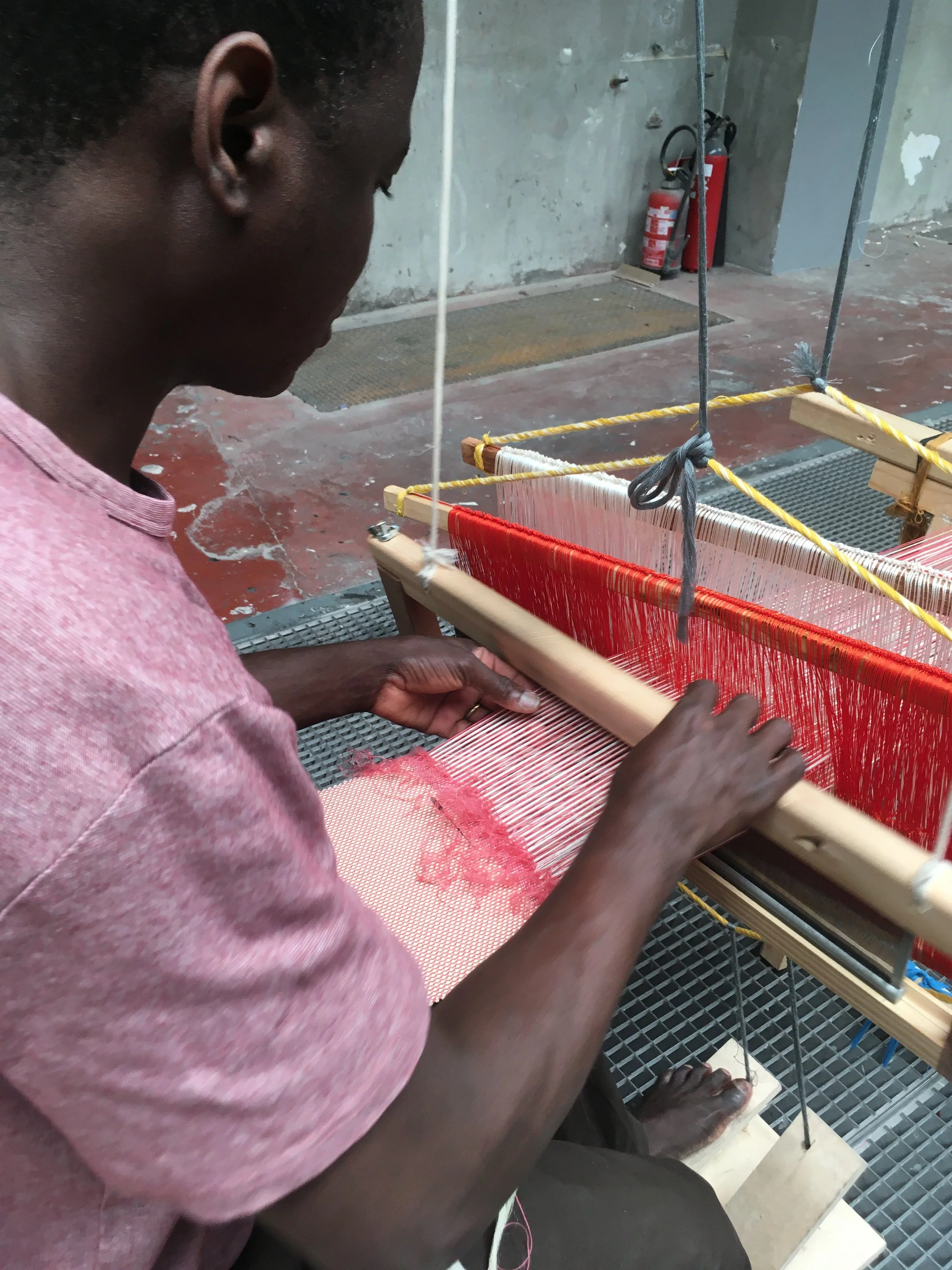 By moving the Beninese loom beyond its borders, it is another aspect of the tool that the duo values. As an extension of the weaver, the fabric strip that comes out of the loom is their experimental medium. It is thanks to this format that they draw new shapes.